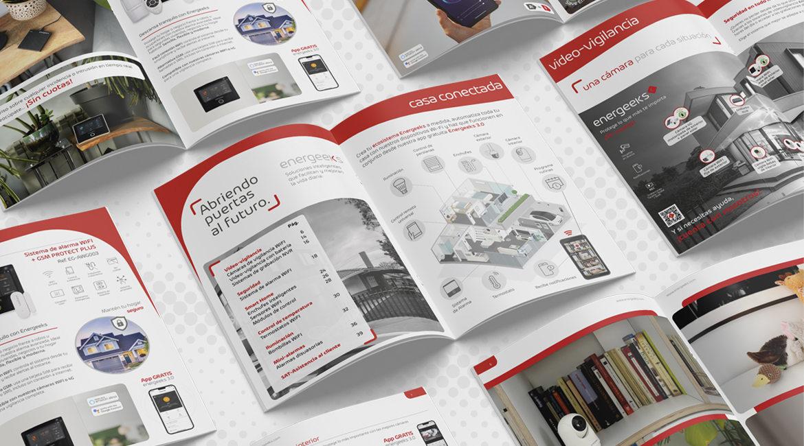 La maquetación de catálogos no solo implica un diseño atractivo, también implica una estructura bien organizada que facilite la lectura y la navegación del usuario. Para el catálogo de Energeeks, seguimos un enfoque estratégico: